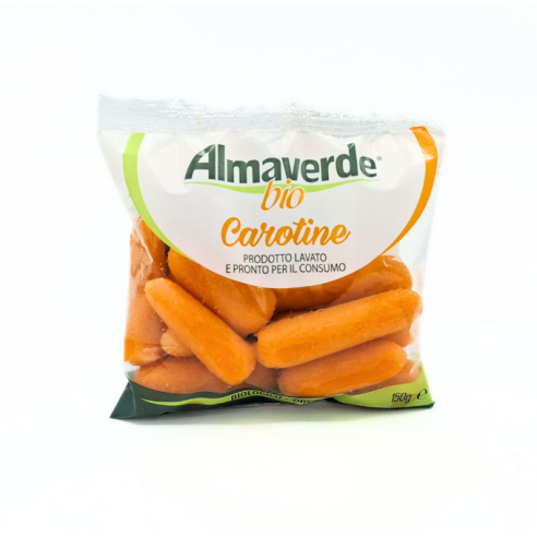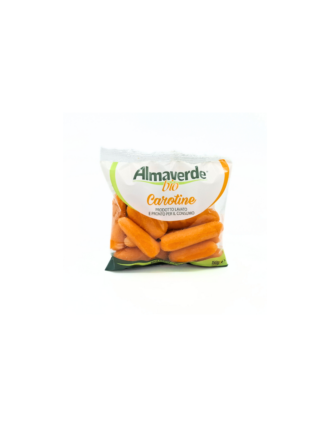 Deliziose mini carote fresche e biologiche, pronte da mangiare. Carotine raccolte, selezionate, tagliate, pelate e confezionate a mano, ideali per uno spuntino pratico, sano e genuino per ripartire a tutto benessere. Solo le migliori mini carote biologiche coltivate in Italia a marchio Almaverde Bio.